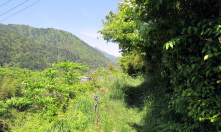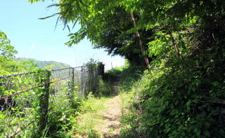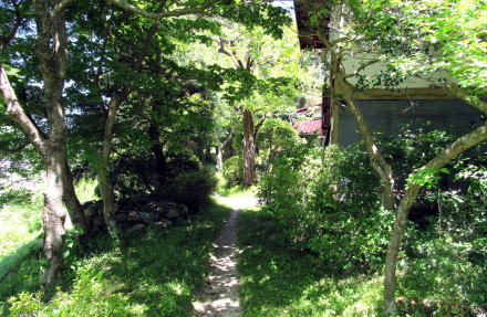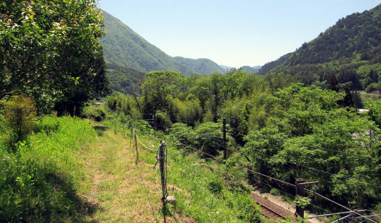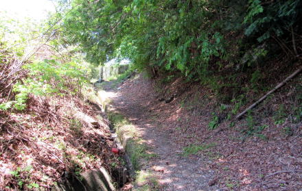 ![]() ▲信毎宮にむかう石段から北に歩き始める。これがくるみ坂。 ![]() ▲金網の左側はJR東海(旧国鉄)の所有地となっていて、 坂道(旧中山道くるみ坂)は幅が半分に削られたらしい ![]() ▲左手の崖下はJR線路が通り、谷間の底には木曾川が流れる ![]() ▲山林が切り開かれて開墾された畑作地跡に出た ![]() ▲段丘崖の下を眺めると、鉄道、国道、木曾川が南北に並行 ![]() ▲この細道が中山道の遺構だという ![]() ▲実に立派な木曾に特有の造りの古民家だ ![]() ▲住む人もなく、漆喰壁の土蔵も無聊をかこちている ![]() ▲ここからは荻原地区の宮戸集落となる。急斜面の上は棚田跡。 ![]() ▲脇に古民家が残るこの小径は旧中山道と木曾古道が重なる部分 ![]() ▲右(南)に分岐する小径は木曾古道に連絡していた 現在は木曾古道の標識が置かれているが、明治時代まではこの小径が中山道だったようだ。 中山道は、この危険な蛇抜け沢を越えるために傾斜が緩くなる高台までのぼって、そこで沢を丸木橋で渡ったと考えられる。 沢沿いに木曾古道があって尾根の杣道(岐蘇路遺構)に連絡していたが、近年の豪雨による土石流や土砂崩れで、経路が閉ざされてしまった。 ![]() ▲滝が連なるように流れる沢と橋は最近改修された。 この地点から滝のように急勾配の沢となるので、往時の技術ではここで渡ることができなかった。 段丘高台の上に宮戸の集落の家並みが見える。 ![]() ▲木曾川に向かって急勾配を滝のように流れ落ちていく沢 |
