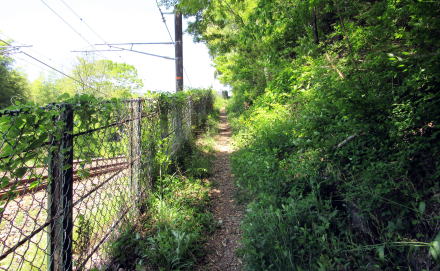 今回の旅は、鉄道線路よりも高いところに残された旧中山道の遺構・痕跡を探る旅になります。だいたい標高650~670メートルの間の斜面に残された旧街道を探ります。 ◆立町で最北端の一軒家◆ 立町神明宮から北に250メートルほどは鉄道建設によって西向きの山裾斜面が切り通されたようで、そのため旧中山道の遺構は、崖の縁を往く細道になっています。