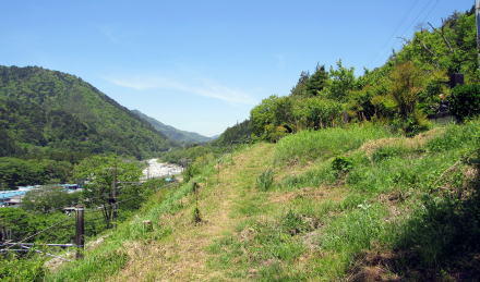 ![]() 登り切ってからクルミ坂(南方)を振り返る。鉄道の擁壁とするために斜面を削ったため、中山道は 崖縁の細道になったらしい。 崖下にはJR中央線が通っていて、右手の谷底に木曾川が流れている。 |