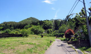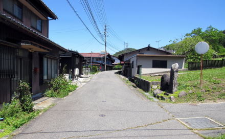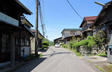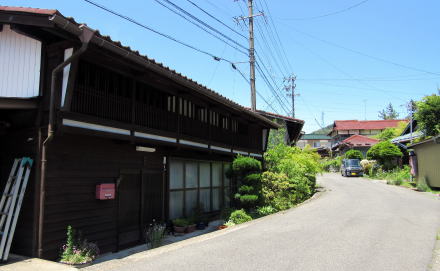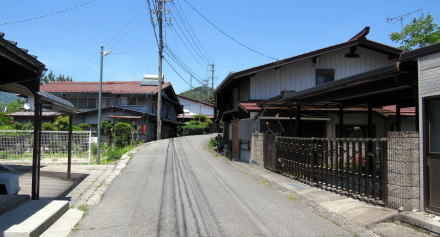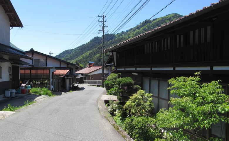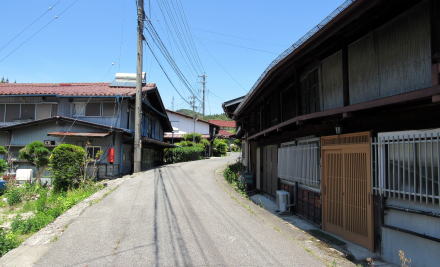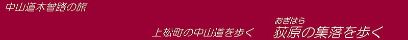 ![]() 荻原集落を往く旧中山道: 家並みの中ほどで来し方を振り返って、街道沿いに並ぶ古民家 |