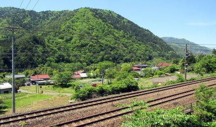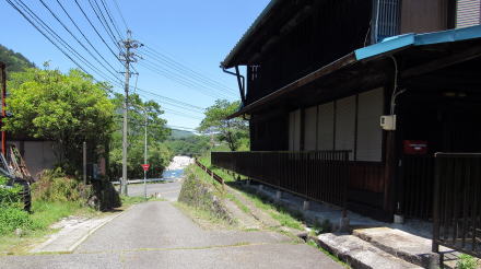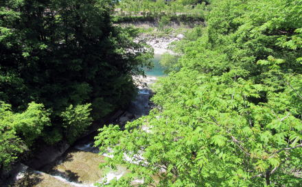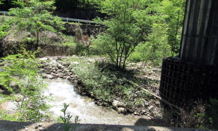 今回の旅では、荻原沢を北に渡って荻原の集落を探索し、そのあと、国道沿いにおよそ800メートル歩いて小野の滝近辺をめざします。 ◆荻原沢と木曾川の合流部◆ 荻原沢は、鉄道橋梁の下から勾配が急に大きくなり、木曾川に向かって急斜面の谷間を滝のように流れ落ちていきます。木曾川に注ぎ込む多くの河川が、合流部の直前で滝のような急勾配になります。共通の傾向ともいえます。そういう地形を目にして、こう考えました。
