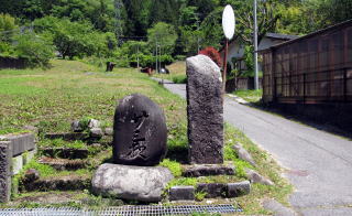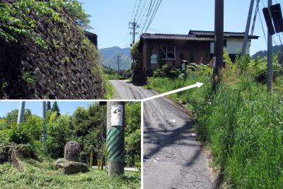 ◆一里塚跡の碑と石垣◆ 旧街道が国道19号に合流する手前に荻原の一里塚跡の碑があります。一里塚は、一里(3.75キロメートル)ごとに街道の両脇に設けられた里程標で、高さ2~3メートル、直径5メートルほどの小丘の上に松や榎が植えられていました。 |