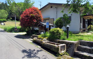 ◆木曽古道への連絡路と水場◆ さて、国道から分岐して30メートルほどの道路東脇に2基の石仏が立っています。向かって左側が二十三夜塔で右が名号塔(念仏塔)です――浄土信仰で「波阿弥陀仏」という念仏を名号と呼ぶそうです。名号は丸い書体で刻まれていますが、それは阿弥陀信仰を説いて回った徳本上人の揮毫がもとになっているのだとか。