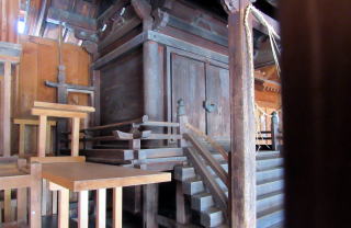 ![]() ▲社殿: 神楽殿を兼ねた拝殿の奥に本殿が祀られている ![]() ▲拝殿の内陣の奥、格子のなかに本殿が祀られている ![]() ▲拝殿前から境内と大鳥居を眺める ![]() ▲八幡宮拝殿の横には摂社の社殿群が集まっている ![]() ▲摂社殿群に本殿はなく荒廃していて摂社の祭神は不明 ![]() ▲玉林院に向かう小路は、泣何やらゆかしい趣き |