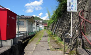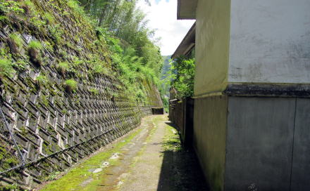 度の宿場でも街道沿いの家並みの背後には原則として、裏道(脇道)があります。それは、参覲旅の藩侯が宿場に休泊した場合、藩侯に随行する家臣が警戒監視態勢を敷くため、住民たちは私用や農耕のために表通りである街道を通行できなくなるから必要なのです。この裏道は、仲町の北端から始まって寺坂の下に出ます。