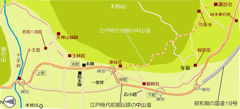 まず、中山道は上ノ山の一里塚の脇から天狗山の尾根をのぼって寺坂を通らないで久保寺と諏訪社の宮の森を抜けて寝覚に連絡していた道筋が、寺坂を経由して材木奉行所の脇を通る経路に変わりました。その結果、当初、上町と本町――当時は下町と呼んだか――の2つしかなかった宿場街が倍以上に拡大して、仲町と下町が加わったのです。