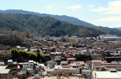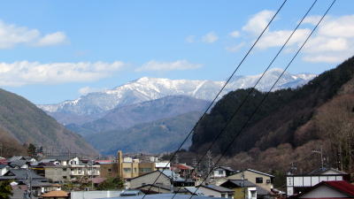 ▲木曾福島本町上の段の丘上から市街地の彼方に中央アルプスを望む