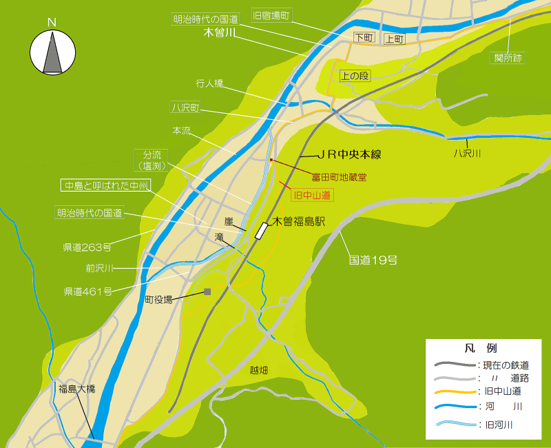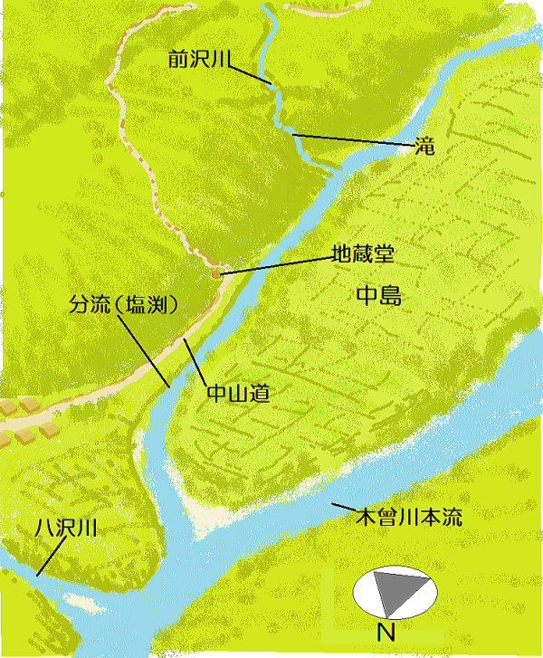 上の絵地図は、1920年代(昭和初期)までの木曾福島中島地区の地形(古地理)を想定復元したものです。 江戸時代、中州だった中島と木曾川分流としての塩、そして中山道をめぐる地形を想像復元した鳥観図を下に掲載しました。