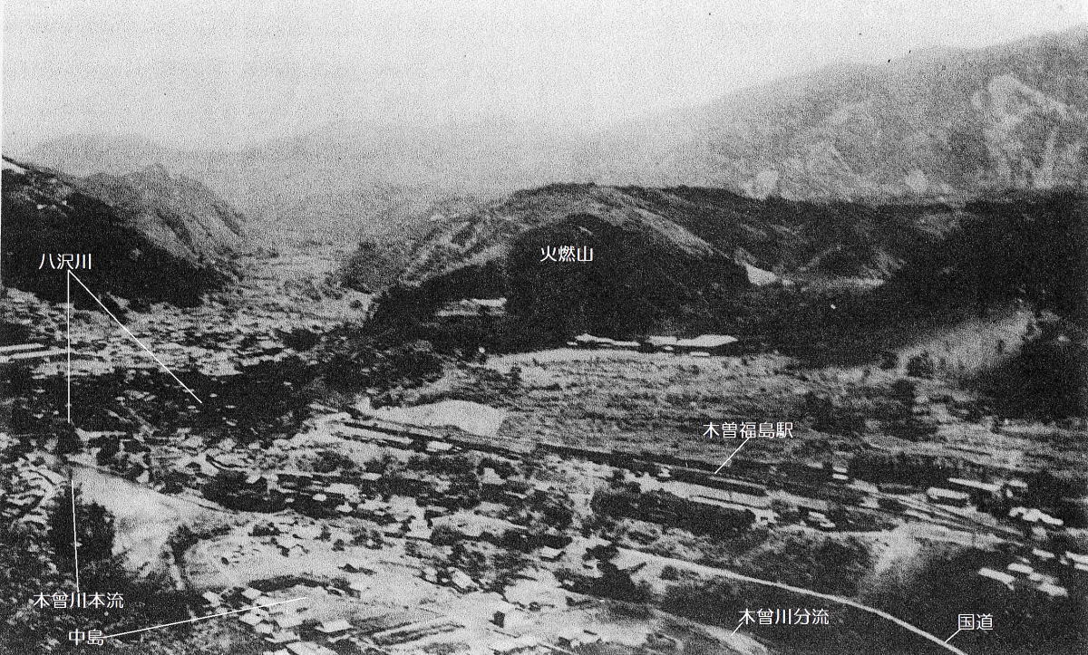 現在、木曽福島駅、駅前観光商店街、木曾町役場がある段丘高台の崖斜面のまぎわまで木曾川の分流が縁を洗っていたのです。塩渕交差点から崖下を通って八沢町まで続く小径は、明治末期に国道として建設されました。 通称「駅坂」とよばれている坂道を下り切った地点の西側から関西電力福島測水所の対岸付近まで、およそ700メートル以上の長さで最大幅200メートル余りの――サツマイモを横から見たような形の――中州があったのです。しかし今、そういう地形の歴史的変遷について知る人も語る人もほとんどいません。 旧中山道が下町から下町・横宿を経て上の壇にのぼり八沢町にいたる道筋となって理由は、この地形にあるのです。 |