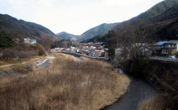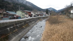 ▲谷間で大きく曲がる奈良井川。右岸が平沢の街。