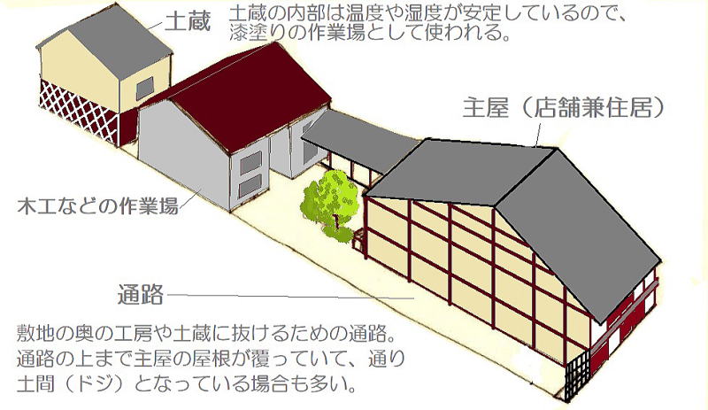 街道に面した主屋(店舗や住居になっている)の内部またはその脇に敷地の奥に抜ける通路が設けられているのです。木工作業場や漆塗り作業場と行き来するためです。
