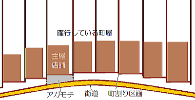 町割りによる敷地区画のなかに長方形の町屋を立てるるうえでは、こういう家屋の配置になるわけです。