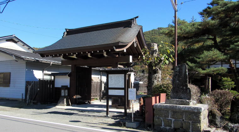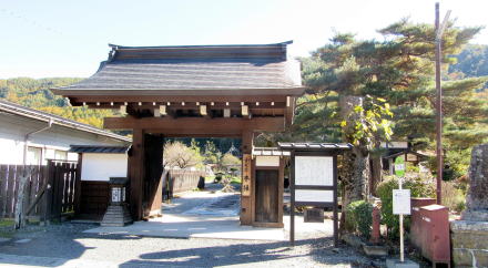 ![]() 大名などの賓客用の薬医門: 当時は杮葺きか茅葺屋根だったと見られる。村上家の正門は別(石碑の右側)にあった。 |
