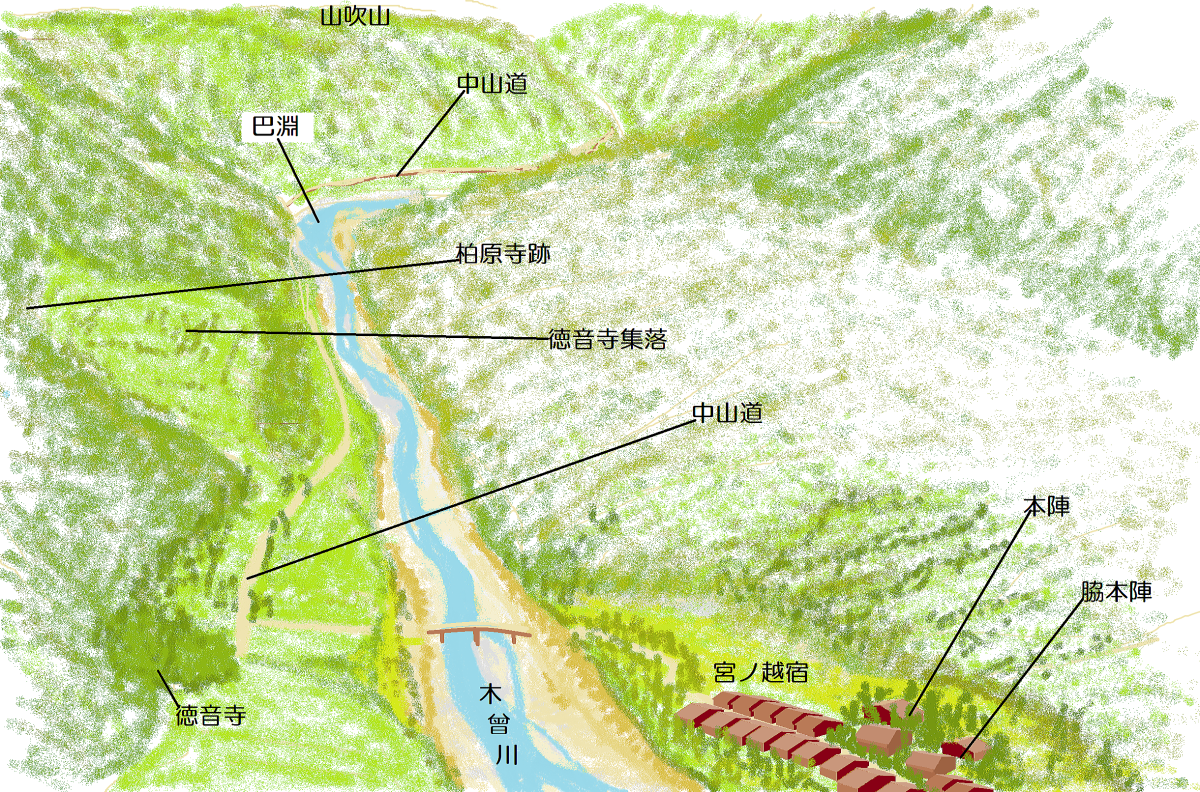 | 上掲の絵は、江戸時代(1800年頃)の宮ノ越宿から巴淵、山吹山方面の地形を鳥瞰した想像図です。 中山道宮ノ越宿は、木曾川左岸の河岸段丘面の古い氾濫原の平坦地――太古、木曾川が東に蛇行して浸食と堆積によって形成した氾濫原――に建設されました。ところが、上田集落から木曾川左岸に5キロメートル以上も続いてきた平坦地は宮ノ越宿の北端で終わります。そこから北の左岸は、東側から張り出した山裾丘陵が急斜面で木曾川に落ち込む険しい地形です。 往時の土木技術では、左岸の底から北に街道を開削することは不可能でした。おりしも、対岸には太古の木曾川の西への蛇行で形成された氾濫原の平坦地が北に向かって1キロメートルほど続いています。そこで、中山道は現在の義仲橋の辺りで木曾川を渡り、徳音寺集落を抜けて巴淵まで開削されたようです。 |