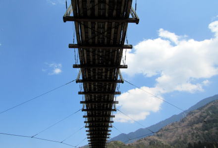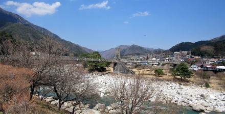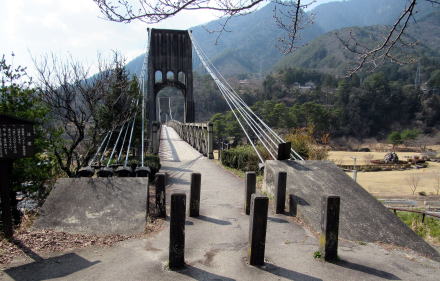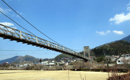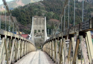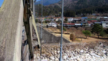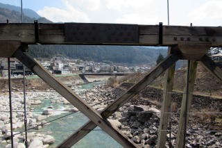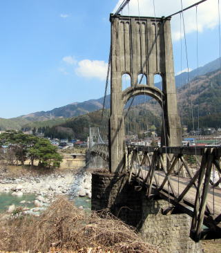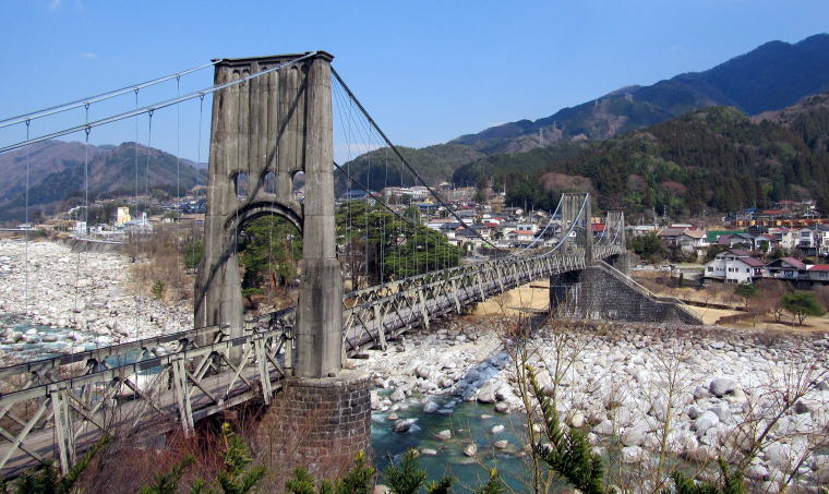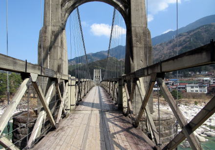 そういう近代産業史を物語る歴史遺産が、木曾川に架かる桃介橋です。この橋は、基本構造が木製の吊り橋です。 ◆木曾谷の風景に溶け込んでいる吊り橋◆ |