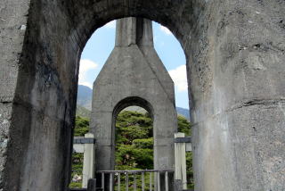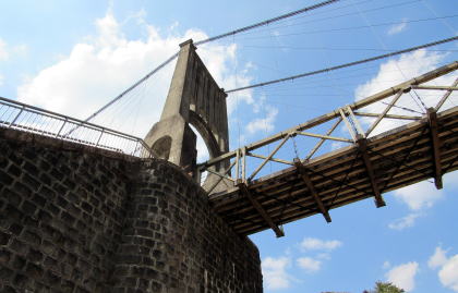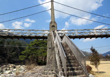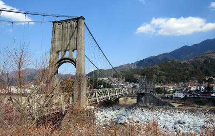 ![]() 木曽川左岸の天白公園の芝生から眺めた桃介橋。3基の橋脚のつり橋構造がよくわかる。右背後は南木曽岳。 |