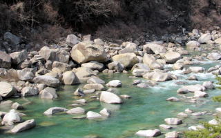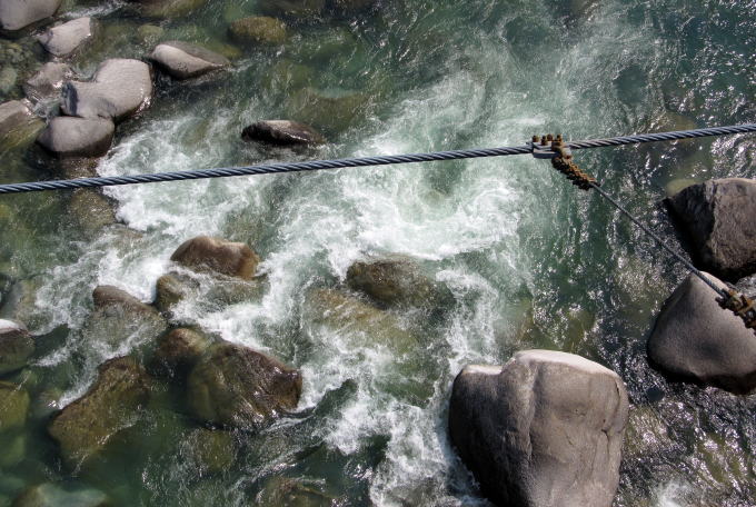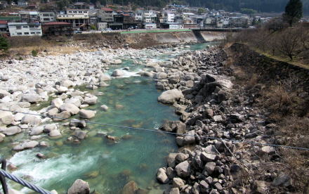 ![]() 桃介橋の下を白く波立ちながら流れる木曾川。清冽な水は青みが勝った暗緑色だ。 |