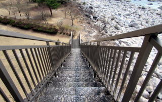 ![]() ▲木曾川に架かる。中央背後の山は三留野愛宕山で城跡がある。 ![]() ▲橋脚の下を右往く橋桁遊歩道。両脇にトラス。 ![]() ▲中山道は対岸を往く。背後の尾根は南木曽岳。 ![]() ▲清冽な水が流れる木曾川。上が下流方向。 ![]() ▲中央の橋脚から河床に降りる石段が美しい ![]() ▲石段の下から振り返って見上げると・・・ ![]() ▲中空にかかる架かる橋梁(中央部から北半分)) ![]() ▲石積みの外観の階段の造り ![]() ▲河床から見上げると・・・天空を往く遊歩道に見える ![]() ▲桃介橋の東端の風景 ⇒蛇抜け沢の探索記事を読む |