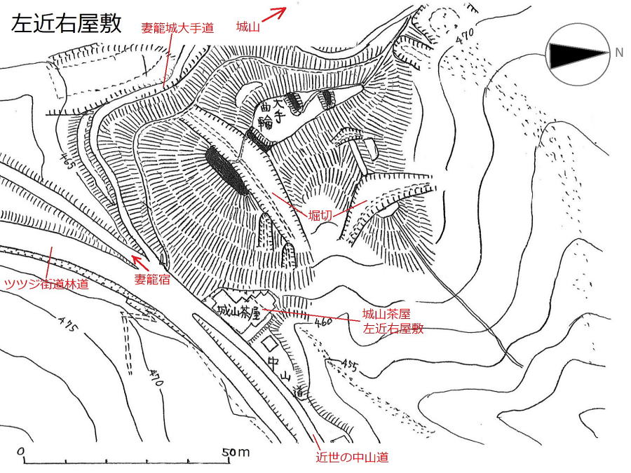 宮坂氏は、現在の街道などの場所を前提して、それを基準にしてこの城砦や設備、構築物を復元図示しています。そこで、城山妻籠城があった時代には左近右屋敷の前には中山道は通っていなかったことを、断っておきます。古中山道は妻籠城の縄張り内を通っていませんでした。
