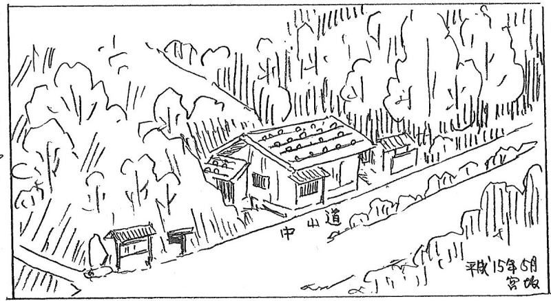 妻籠城へ登る大手道の起点近くに城番役の杉村右近右衛門の役宅――およそ20坪ほどの小さな家屋――があったと伝えられています。そこに城山茶屋があったとも伝えられていますが、城砦があった頃ではなかったはずです。軍事施設の入り口に茶屋を置くはずがありません。妻籠城が破却され、その東麓に中山道が開削建設されて以降のことだと考えられます。