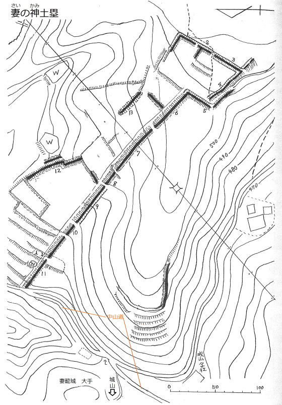 南木曽岳の主稜線から西に張り出した尾根のひとつの中腹に「妻の神土塁」と呼ばれる不思議な構築物があります。城山の妻籠城の東方の向かい側に位置しています。構築物の全長は500メートル以上あるそうです。