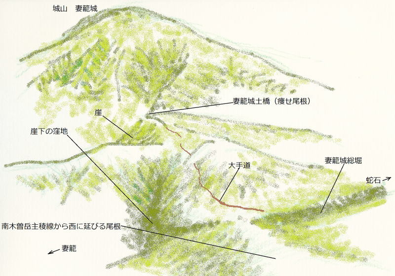 古中山道は、このような危険な場所を避け、妻籠城の縄張りを迂回するために、蛇石が沢の渓谷沿いに東側の尾根を越えていくことになっていたと見られます。