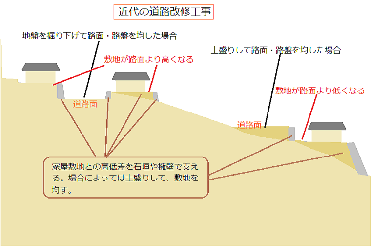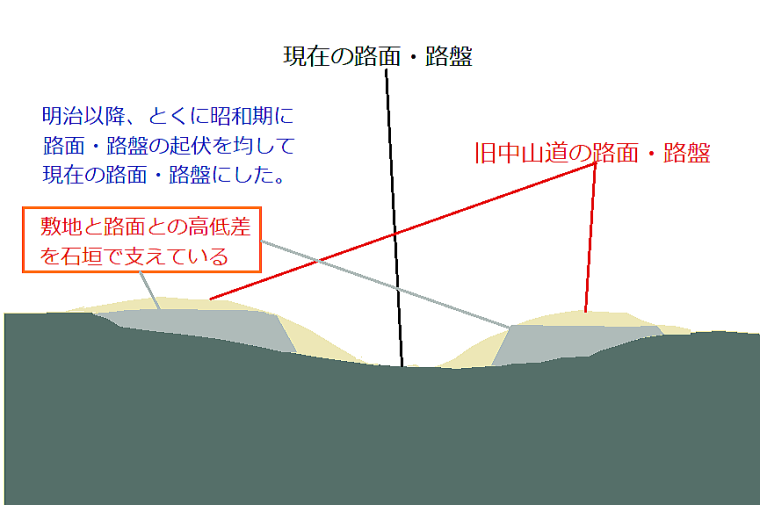 上の絵図は道筋に沿った断面で見た図で、近代になって中山道の路面の起伏を改修して均したため、旧中山道の路面・路盤に合わせてあった家屋の敷地と新たな路面・路盤とにあいだに高低差が生じた様子を示したものです。