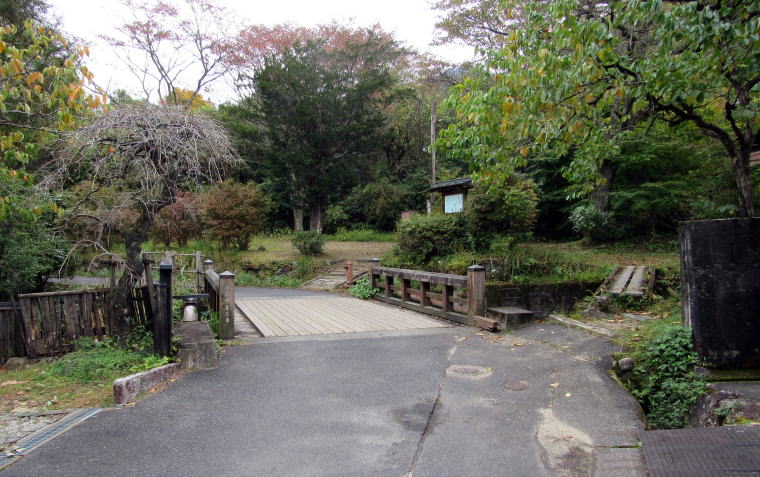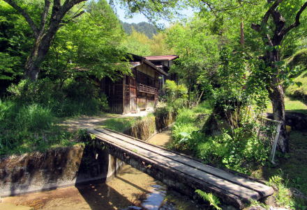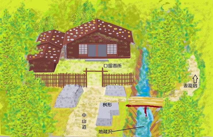![]() 妻籠宿の北の端、地蔵沢川に架かる木造の端、地蔵沢橋。背後の草地には江戸時代に尾張藩の口留番所があった。 戦国時代の末期には木曾は徳川家の支配地で江戸時代初期まではそのまま幕府の直轄地(天領)となりましたが、幕藩体制が確立されるとともに尾張藩領に移管されました。とはいえ、木曾の山林(木材などの森林資源)は幕府の統制下に置かれながら、尾張藩が直接に統治するという形になりました。往時、地蔵沢の畔の口留番所は、福島にある尾張藩山村代官所が差配して、街道を行き交う人びとと物流を監視していました。地蔵沢橋の北、番所跡の前では街道がほぼ直角に曲がっているので、幕末まで桝形があったと見られます。