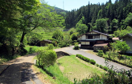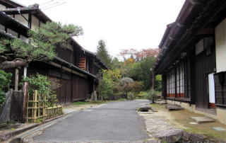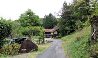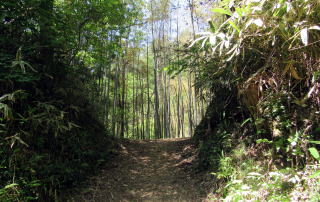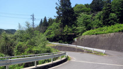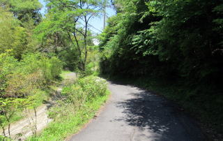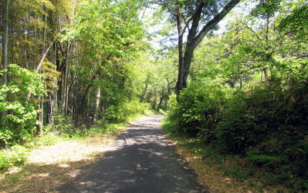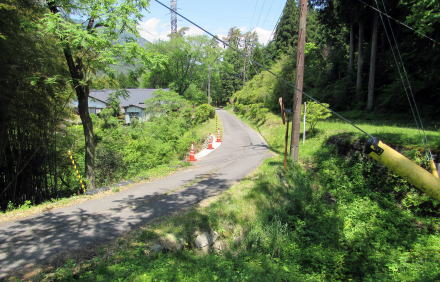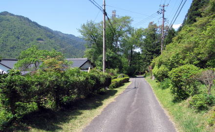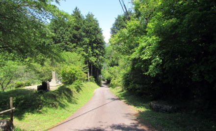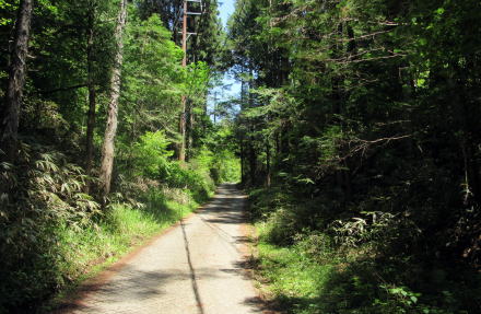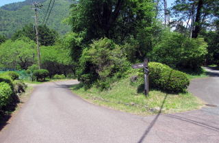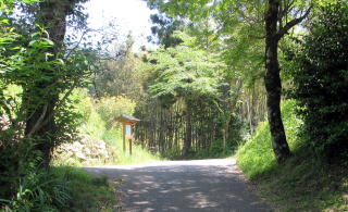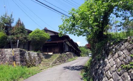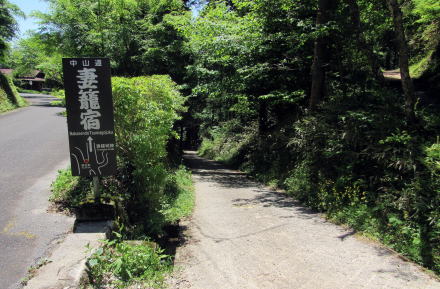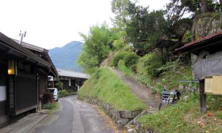 尾張藩山村代官所は木曾路全体を統治していて、南は馬籠宿の西の十曲峠から贄川の桜沢までを管轄していました。藩境でもない妻籠宿北端に番所を設けていたのは、妻籠がきわめて重要な交通の要衝だったからでしょう。 さて、口留番所前から500~600メートルほど北で、いよいよ山林にのぼっていく小径と国道19号に向かう道が分岐します。小径に入ってしばらく西に向かい、まもなく右に曲がって北向きに転じると、針葉樹が中心の森のなか、やや急斜面の狭い舗装道路をのぼることになります。