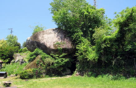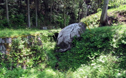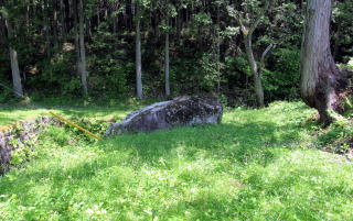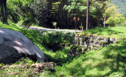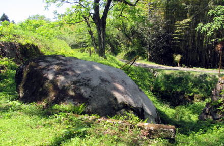妻籠城址の案内板から300メートルほど北に進むと、渓流の縁にある蛇石にいたります。この大石は、西から眺めると、亀裂や紋様からシマヘビの頭に見えないこともありませんが、形状全体としてなぜ蛇石と呼ばれたのかわかりません。