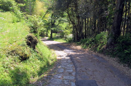 ![]() ▲現在の地蔵沢の流れと小さな木の橋。細い橋が架かっている。 ![]() ▲街道の名所、鯉岩。地震で壊れて今の形になったらしい。 江戸時代の道中旅案内の絵図によると、縦長の巨大な岩で、鯉が頭を上にして胸鰭を腹側に突き出し、滝を昇っているいるような形だったらしい。⇒復元絵図を見る ![]() ▲鯉岩の小丘下の家並みは往時の風情をとどめている ![]() ▲尾又地区では中山道の南側には山が迫っている(北からの眺め) ![]() ▲路面の起伏を均し、敷地との落差を石垣で支えるようになった 妻籠から南木曽までの中山道は、木曾川の支流、蘭川がつくった谷間を往く道だ。南北に続く谷間に南木曽岳から続く何本もの尾根が西に張り出している。 そうなると、おおむね南北に往来する中山道は、東西に延びる尾根を上り下りし、あるいは尾根の間の沢の谷間をうねるように迂回するつづら折れの道筋となる。 ![]() ▲右に分岐して丘をのぼる道が旧中山道 ![]() ▲山林のなかを急な坂道が続く ![]() ▲右の小径が妻籠に往く。左側はツツジ街道と呼ばれる林道。 ![]() ▲街道の西脇に竹林が現れた。この先に名所、蛇石がある。 ![]() ▲緩やかな曲り道の下を急傾斜の沢が横切っている ![]() ▲曲がりくねった沢の縁にある蛇石(花崗岩質) ![]() ▲蛇石は谷の縁に引っかかっているような配置だ ![]() この渓流の縁壁面は石垣で支えられている ![]() ▲蛇石から北に向かう街道小径 ![]() ▲緩やかな下り坂の西脇にヒノキ林がある ![]() ▲一里塚の下から南を見ると、小洒落た出梁造りの民家がある ![]() ▲石畳の小径と竹林が素敵な風情をかもしだしている ![]() ▲上久保の一里塚: 街道西側の塚山 ![]() ▲上久保の一里塚: 街道東側の塚山は尾根段丘の上にある 街道の東脇の塚山は段丘上にあって路面との高低差(比高)は4メートル近くあり、西脇の塚山は比高が2メートルほど。東西の塚山の比高が2メートルほどもある。 江戸幕府(徳川家門)にとって、木曾は政治的・経済的・軍事的に飛び抜けて重要な戦略的地域でした。1515年まで幕府直轄地の代官だった山村家は、木曾が尾張藩に編合されると、尾張藩の高官として、引き続き木曽地方を直接に統治し続けることになりました。尾張藩山村代官は、本拠の福島、木曾路の北端=贄川と妻籠に関所を設けました。ことに妻籠は、美濃への出口の馬籠峠の北端にあって、伊那・飯田や飛騨高山方面からの街道が交差する要衝でした。 |
