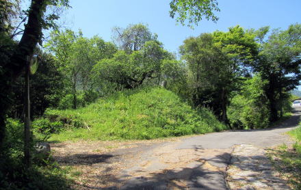 蛇石から北に120メートルほど進んだところにカーブミラーと近代に造られた石道標があって、ここの分岐点で左折します。すると緩やかな下り坂になり、道の西脇にヒノキ林が60メートルほど続きます。この林の北西側は切り開かれてて、今は数軒の住宅地となっています。その北側は沢がつくった谷間となっていて、道は大きく曲がって谷間に降りていきます、ここは渡島と呼ばれる地区で、谷底 お平坦地に茶屋があったそうです。