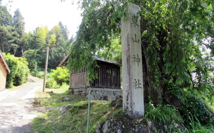 三留野宿から南木曽岳山頂の方向を見上げると峰が立ちはだかっています。宿場街の東にあるので、東山と呼ばれています。 その西向きの尾根、等覚寺の背後にあるのが東山神社です。背後から等覚寺と三留野宿を守るように見おろす位置にある神社です。この神社と寺院との結びつきを明示する地理的配置は、明治よりも前の神仏習合の伝統を強く残しています。中山道は、明治維新の騒乱としての廃仏毀釈が西から東に伝播した経路であったにもかかわらず、貴重な宗教的=文化的遺産が保たれているのです。 ◆古くは牛頭天王社と呼ばれていた◆ |