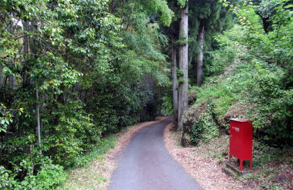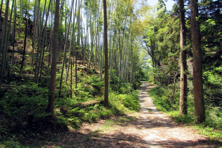上久保の一里塚を過ぎてから60メートルほどで旧中山道は東向きに曲がり、千沢の谷間に降りていくことになります。やや急斜面の坂道ですが石畳になっています。小径の右脇の段丘崖斜面は、端正に整備された竹林になっています。藪ではなく、柔らかに陽射しが入り込む美しい景観が楽しめます。