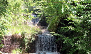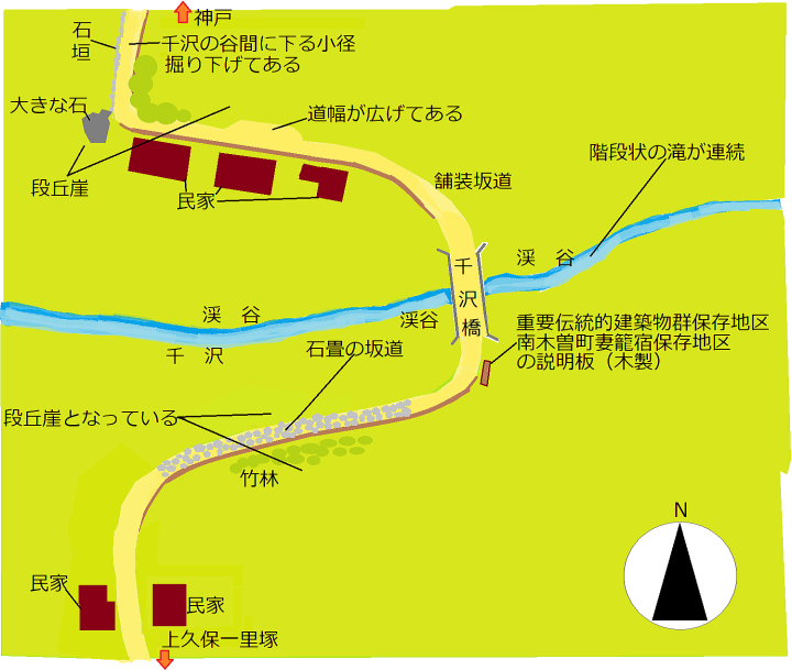 坂を下りきったところに千沢橋があって、その手前(南側の袂)に「重要伝統的建築物群保存地区/南木曽町妻籠宿保存地区」の説明板が立っています。千沢は急傾斜の渓流で、橋の上流部には階段状にいくつも堰堤が築かれ、連続する滝となっています。滝という形で流水を垂直に落とすことで、位置エネルギーを消費させて流速(流水の破壊力)を減殺するためです。 ところで、南木曽町の読書・神戸の辺りで、木曾川の流れは南木曽岳の尾根によって押されて、蛇行しながら南から西に向きを変えることになります。これによって谷の横幅が広がり、木曾川の浸食作用で南木曽岳の西麓に幾重にも重層する河岸段丘が形成されます。そこに南木曽岳から流れ下る千沢や蛇抜沢あるいは梨子沢などの木曾川の支流が渓谷を刻みながら、土砂を運び堆積して複合扇状地をつくります。