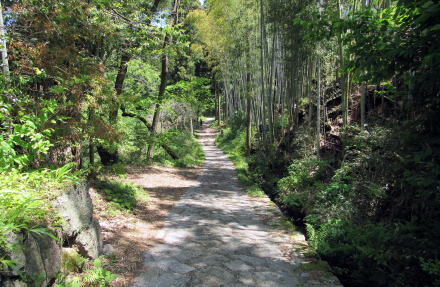![]() 千沢左岸の石畳の坂道:渓谷に落ち込んでいく段丘崖の中腹にあって、整備した竹林が美しい 中山道の杣道のうち急坂では、江戸時代から路面に石畳を施して、降雨による土砂の流失を防ぐ工夫をしてきました。ことに、幕末の和宮内親王の徳川将軍家への降嫁にさいして中山道を大幅に補修したため、路面状態は格段に良くなりました。この千沢渓谷の石畳は、そのときの工事によって始まったのかもしれません。