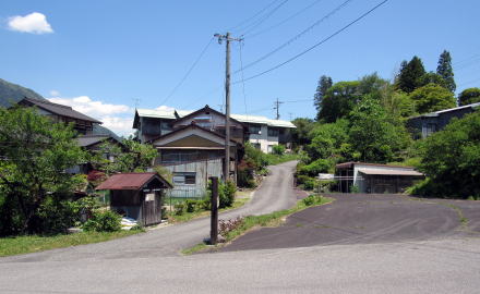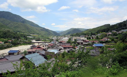 園原家住宅の西側の丘の下にJR南木曽駅があって、ここから三留野宿の入り口まで約1.1キロメートルの道のりです。ここからは、南木曽町の東の郊外に近い住宅街を往くことになるので、視界は開けています。西側に谷の底を流れる木曾川と河畔の市街を見おろしながら歩くことになります。地形としては、梨子沢がつくった幅広の谷間の扇状地を等高線に沿って進むことになります。 |