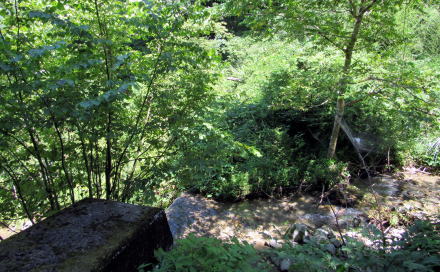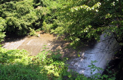 ![]() 八人石沢は十二兼の集落の北端の段丘崖下を木曾川に流れ落ちていく。堰堤滝の向こう岸(北岸)に大きな岩があったという。 |