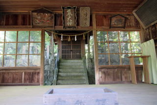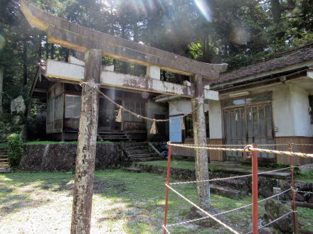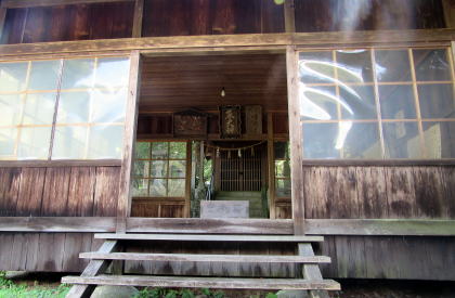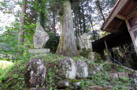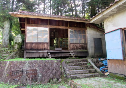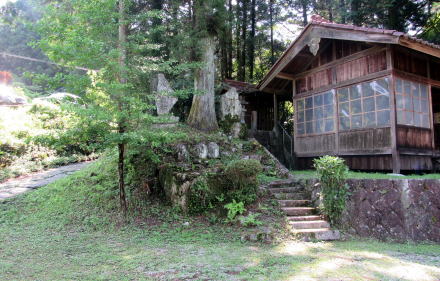 ![]() ▲水路トンネルを出て集落の入り口にたつと、崖の上に熊野社がある ![]() ▲集落の端から熊野権現社の境内入り口を眺める ![]() ▲境内に入って北を振り返ると、集落の家並みが見える ![]() ▲狭い境内の西端は崖縁で、そこに鳥居が立っている ![]() ▲境内西端の崖の上に樹々が立っている ![]() ▲境内の東寄りに拝殿と本殿、社務所が並んでいる ![]() ▲鳥居の脇から東向きに拝殿を眺める ![]() ▲横長の拝殿には、今時珍しい木製の階段をのぼって入る ![]() ▲幣殿の奥(背後)の石垣上に本殿が祀られている ![]() ▲本殿西脇の石塔群: 左側が八剱神社で右側が熊野社の碑。八剱神社は中川原立場の傍らからここに合祀された。 ■熊野信仰の修験場■ 現在残っている熊野社は、江戸時代には、十二兼の集落の東側に広がる山域全体の修験霊場の「ほんの入り口」つまり里宮(一番下の堂舎群)にすぎなかったようだ。