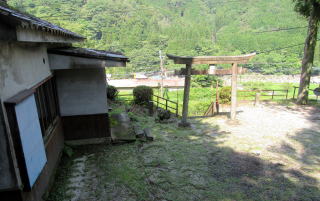 ![]() 家並みの側から南向きに熊野社の境内を眺める。鳥居の向こうは4メートルを超える崖になっている。 |