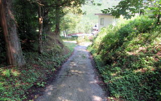 ■崖の上の熊野権現社■ 国道19号の下をくぐる水路トンネルは、熊野沢の小さな渓谷を通ります。この渓谷をのぼって十二兼の集落に向かいます。旧中山道は崖の下北に向かう舗装された小径す。崖の上が熊野権現社の境内です。