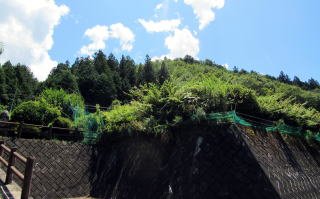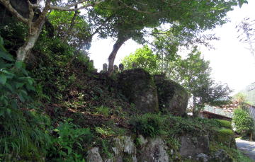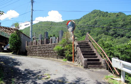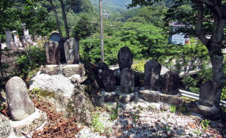 ![]() ▲高台北端の崖縁には「花戸」の墓地がある ![]() ▲往古、この尾根峰の上に熊野権現の社が祀られていた ![]() ▲崖縁の「花戸」家の前から野尻城山を眺める。 ![]() ▲中山道から石仏と二十三夜塔にのぼる石段 ![]() ▲崖縁の岩の上に並ぶ石仏群(馬頭観音) ![]() ▲様々な形の石仏たち。ほとんどは馬頭観音像。 ![]() ▲手前は聖観音像で、その奥は念仏塔 ![]() ▲段丘崖の下(裏側)から石仏群を見上げる ![]() ▲石仏群より少し奥にある自然石の二十三夜塔 ![]() ▲石仏群から尾根崖縁を進む細道。古中山道の跡か。 この細道の左側の藪の下は崖で、谷底を八人石沢が流れている。この先で谷底に下る経路があるという。降雨後に沢の水位が高くなったさいには、旅人はこの細道を通って沢を渡ったらしい。 |