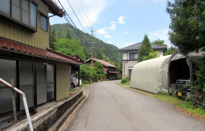 木曾川に支流が合流する場所では、木曾川の峡谷と支流の渓谷とが合わさって、小さな平坦地や扇状地が形成されています。柿其川と木曾川の合流点もそうなっています。そういう場所には小さな集落が形成され、人びとの営みの空間がつくられています。