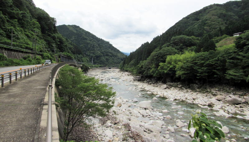 さて、三留野宿から旧中山道に沿って北上し、木曾谷を北向きに下っていくと国道19号に合流します。古い街道は、国道と鉄道の建設にともなってそれらの下に埋もれてしまったようです。急傾斜の谷間のなかとて、ほかに道がないので、国道を北上して柿其入り口まで歩きましょう。