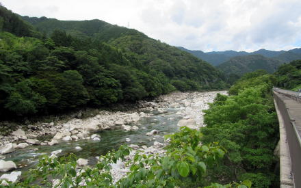 三留野宿を出て旧中山道を北に進み、木曾川の縁に出ると、そこには巨大な峡谷しか見えません。川岸は、木曾川が両岸の山並みを削り出してつくった崖です。谷間には急峻な斜面しかないのです。
