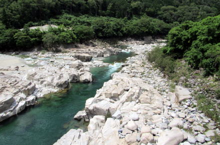 柿其橋の周りに広がった谷間は「中河原峡」と名づけられています。上松の「寝覚の床」ほどの規模には及びませんが、中河原峡には大きな花崗岩が集積した美しく壮大な河岸の景観があって、「南寝覚」と呼ばれています。