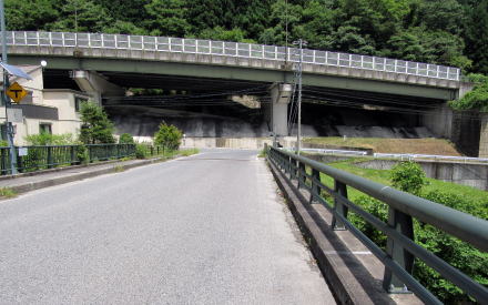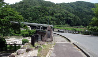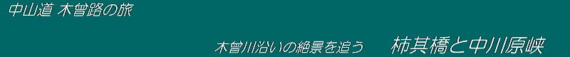 ■中川原峡■ 国道19号を与川の木曾川への注ぎ口から2キロメートル余り北に進むと「柿其入口」の交差点があります。ここで左折して、木曽川左岸を国道と並走する旧中山道を歩き、柿其渓谷の入り口をめざします。およそ400メートルで柿其橋の東袂にいたります。