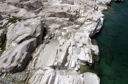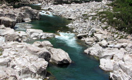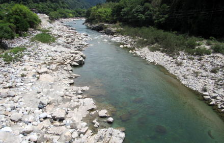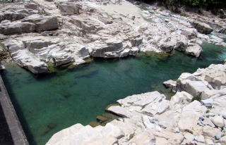 ![]() 柿其橋から中川原峡を俯瞰する: 木曾川と花崗岩質の岩壁 |