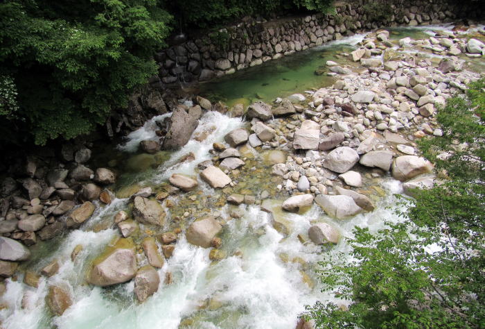 ■岩棚から峡谷を見おろす神社■ 柿其橋の西袂にある岩棚は、柿其川と木曾川の水流がぶつかり合って合流する地点にあります。2つの川による荒々しい浸食作用の産物です。その岩棚の上に八剱神社の境内神域が設けられています。 no 大国主は鉄剣の製造を独占していた出雲の国主(王)ですから、八剱とはおそらく大量の鉄剣(鉄製の武器や武具)を意味するのでしょう。大国主は神話では大和王権に臣従し、王権への鉄剣の供与を担ったようで、大和王権は鉄剣の威力と騎馬団によってその権力と権威を広げることになりました。