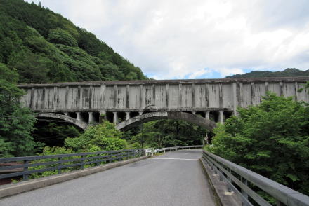 左の写真の奇妙な形状の架け橋は、読書発電所の発電機を回転させる流水を供給するための導水路のうち、柿其川を渡る鉄筋コンクリート造りの水路橋です。1923年(大正12年)の建設で、全長は142.4m。中央部は2連アーチ橋構造で、両端部は桁橋となっています。現存する戦前の水路橋のなかでは、最大級の規模だそうです。 |